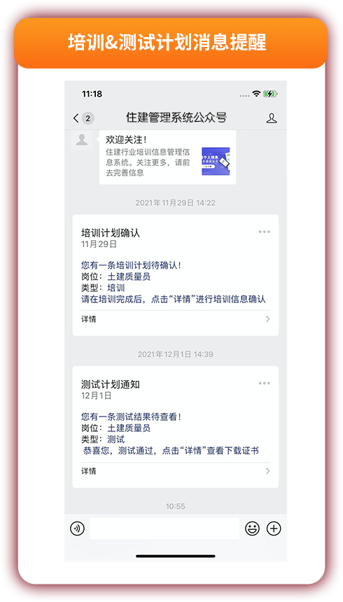 关注并绑定个人信息,实时在线查看行业动态。动态化提醒培训,测试消息,一键操作培训&测试状态确认;